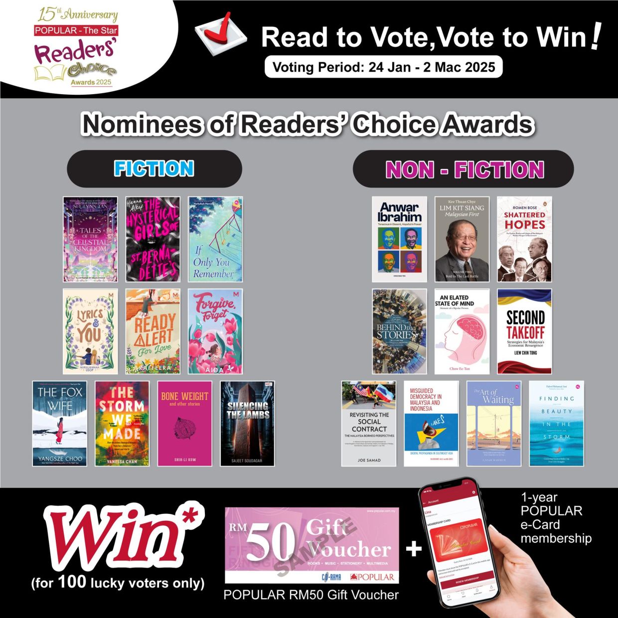 Readers are encouraged to vote for their favourite fiction and non-fiction titles on Popular’s website, the BookFest @ Malaysia website or Popular Malaysia’s Facebook page from now till March 2.