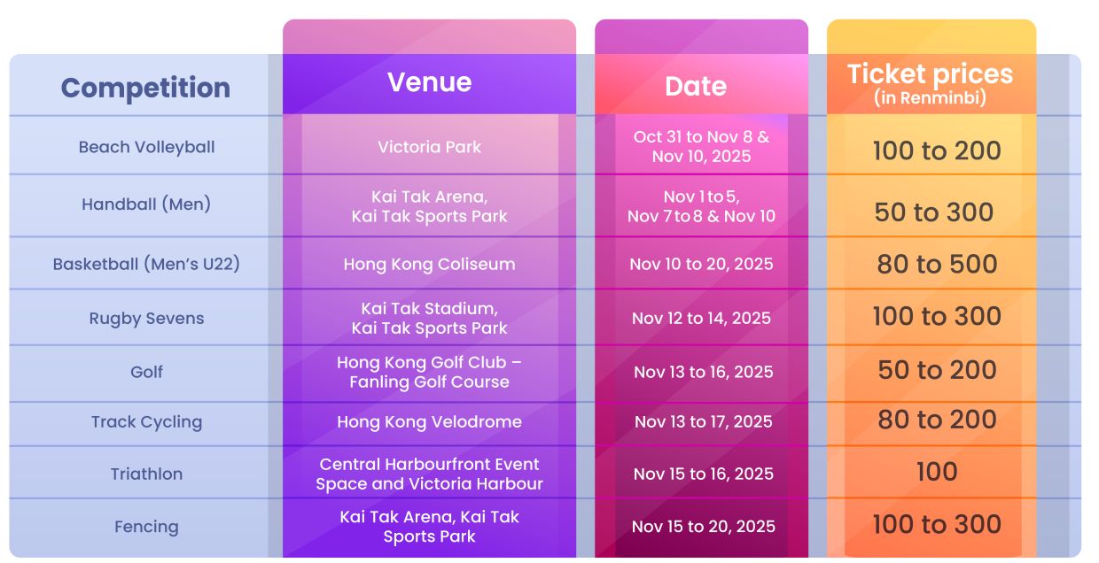 Tickets for the National Games in Hong Kong will be sold in the form of half-day or full-day passes.