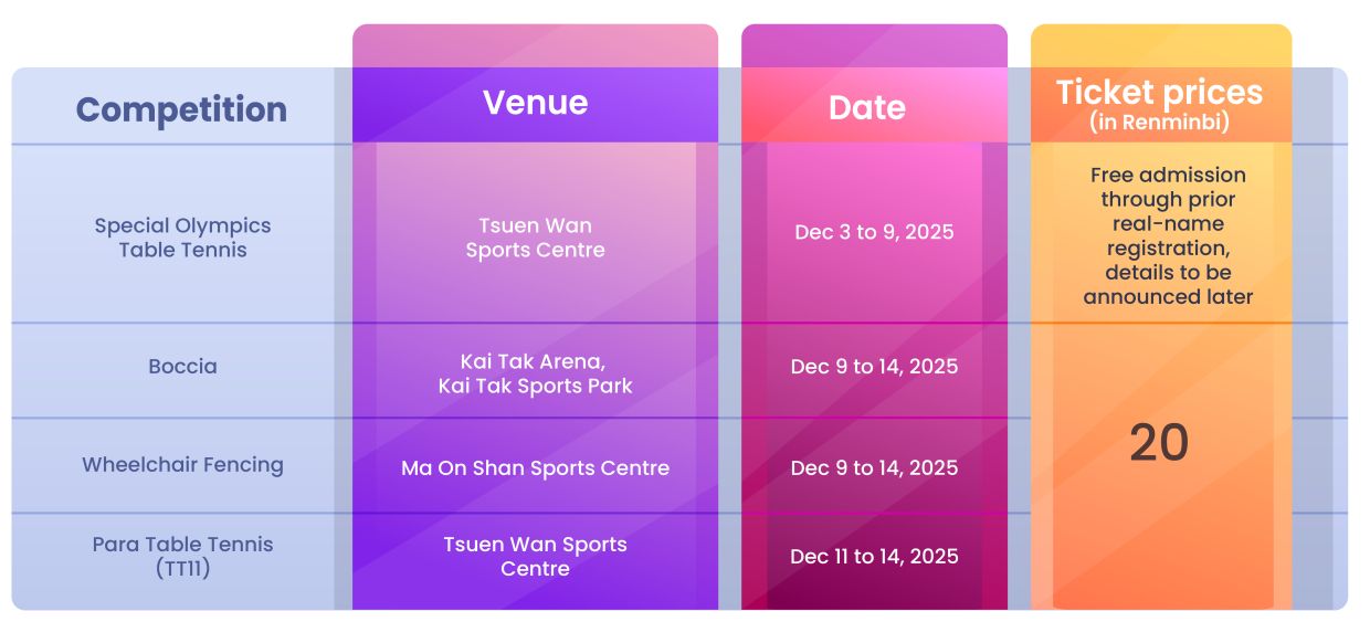 The following month, Hong Kong will host four competition events under the 12th National Games for Persons with Disabilities and the 9th National Special Olympic Games: