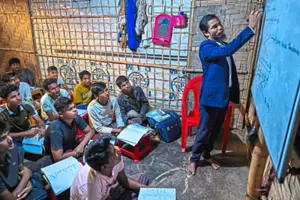 Books tucked under their arms, children file into a small classroom in the country's vast refugee camps, home to more than a million Rohingya who have fled neighbouring Myanmar.