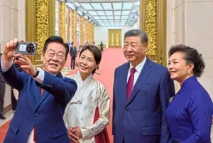 South Korean President Lee Jae-myung snapped a selfie with Xi Jinping using a smartphone gifted to him by the Chinese leader, who had joked at their last meeting that the device might be capable of spying.