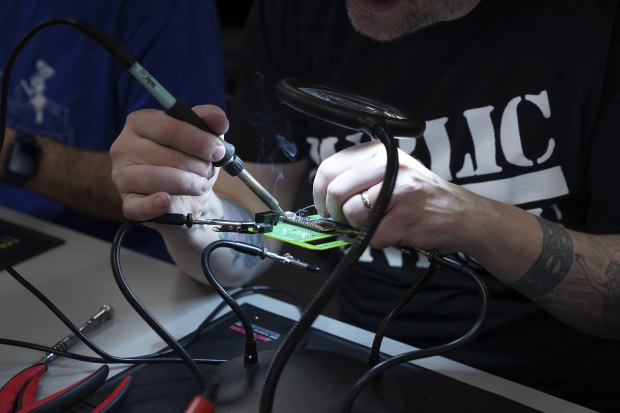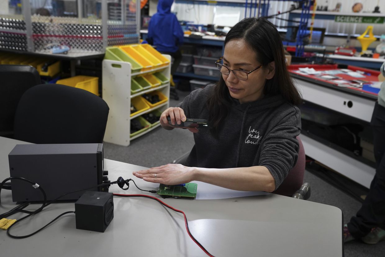 Minh Ha, assistive technology manager at the Perkins School for the Blind, tries a LightSound device for the first time at the school's library in Watertown, Massachusetts, on March 2, 2024. As eclipse watchers look to the skies in April 2024, new technology will allow people who are blind or visually impaired to hear and feel the celestial event. — AP
