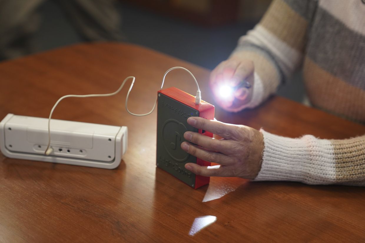 The Perkins Library – associated with the Perkins School for the Blind in Watertown, Massachusetts – plans to broadcast the changing tones of the LightSound device over Zoom for members to listen online and by telephone, said outreach manager Erin Fragola.