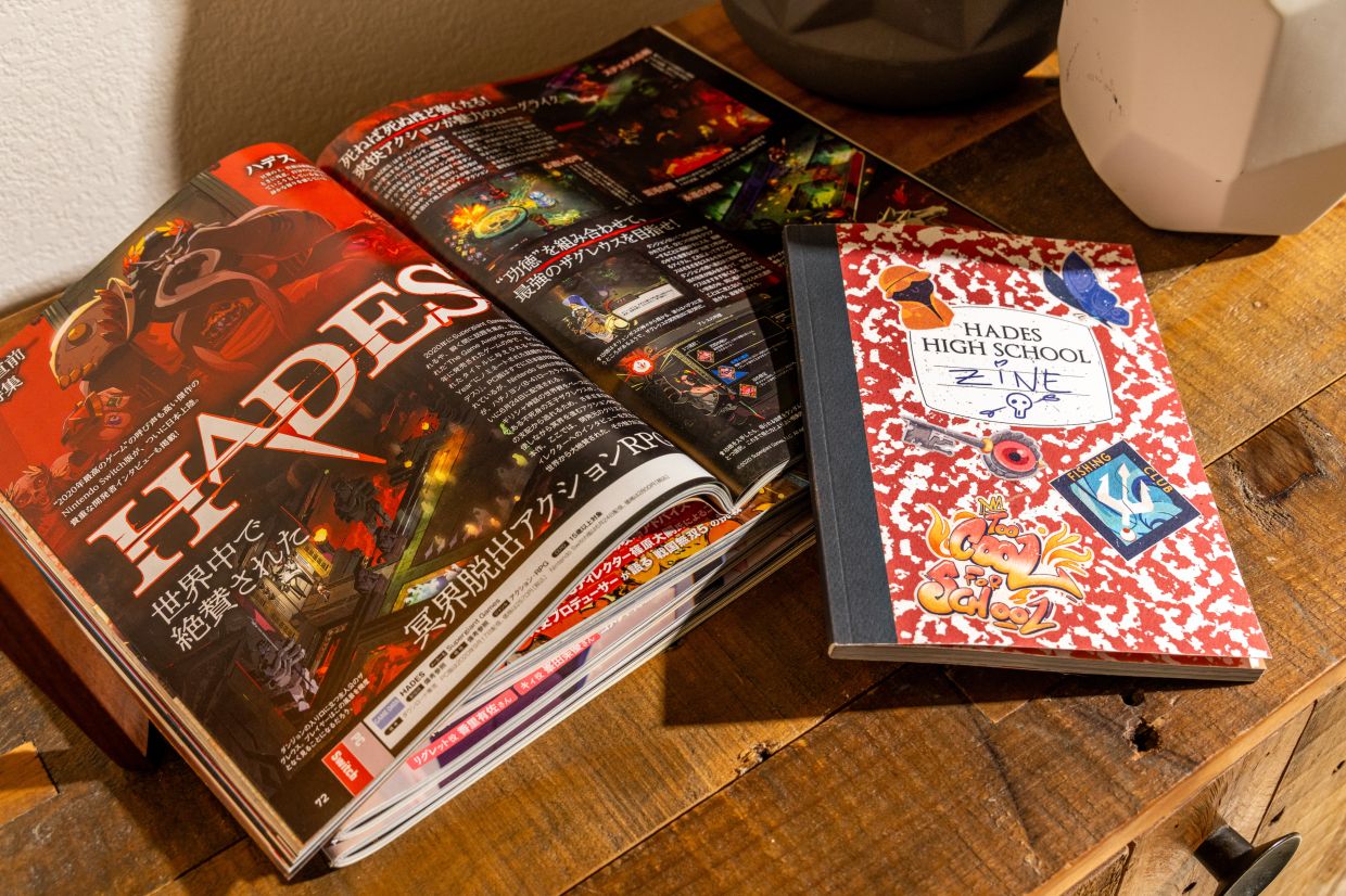 Fanmade memorabilia, including a cookbook and a zine, are displayed at the offices of Supergiant Games in San Francisco on May 2, 2024. Hades won numerous industry accolades, including game of the year awards, as well as prestigious Hugo and Nebula Awards. — The New York Times