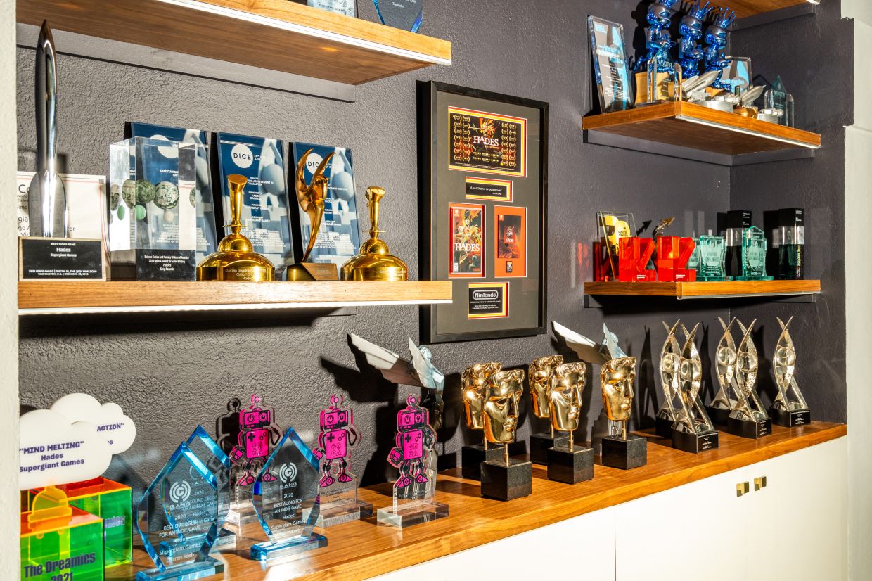 Industry awards are displayed at the offices of Supergiant Games in San Francisco on May 2, 2024. Hades won numerous industry accolades, including game of the year awards, as well as prestigious Hugo and Nebula Awards. — The New York Times