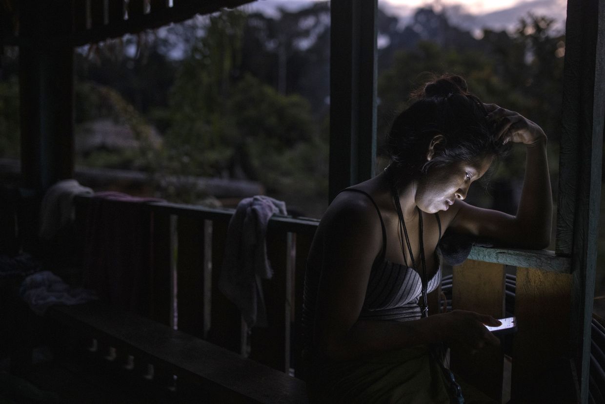A villager uses her phone, connected to the internet via Starlink, in Manakieaway, a Marubo village in BrazilÕs Acre state on April 7, 2024. (Victor Moriyama/The New York Times)