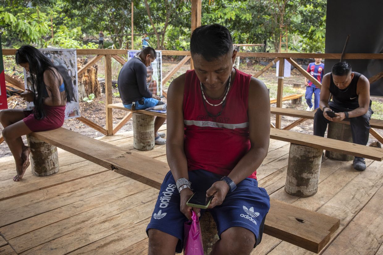 Marubo people use their phones, bought in the closest city, when the Starlink antenna is turned on in their village, in Manakieaway, a Marubo village in Brazil’s Acre state on April 8, 2024.