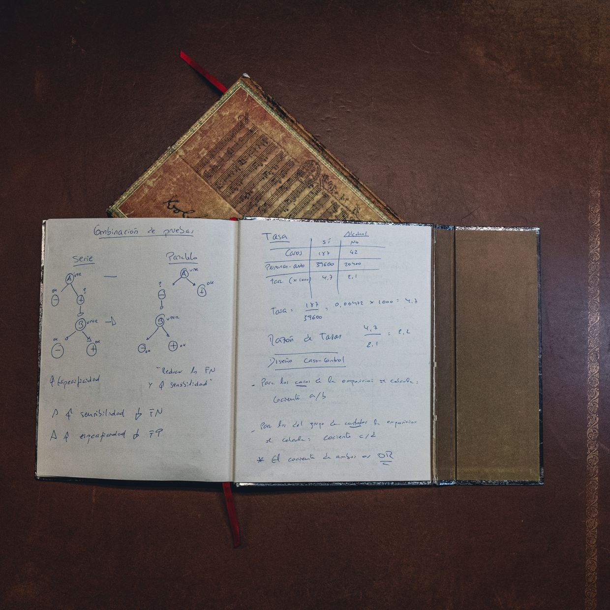 A notebook is displayed in the office of Juan José López Ossorio, a government official who helped create the VioGén system, in Madrid on April 30, 2024. It is open to show some initial designs and research strategies for what became VioGén, including a decision tree and calibration techniques for predicting intimate partner homicides. — The New York Times