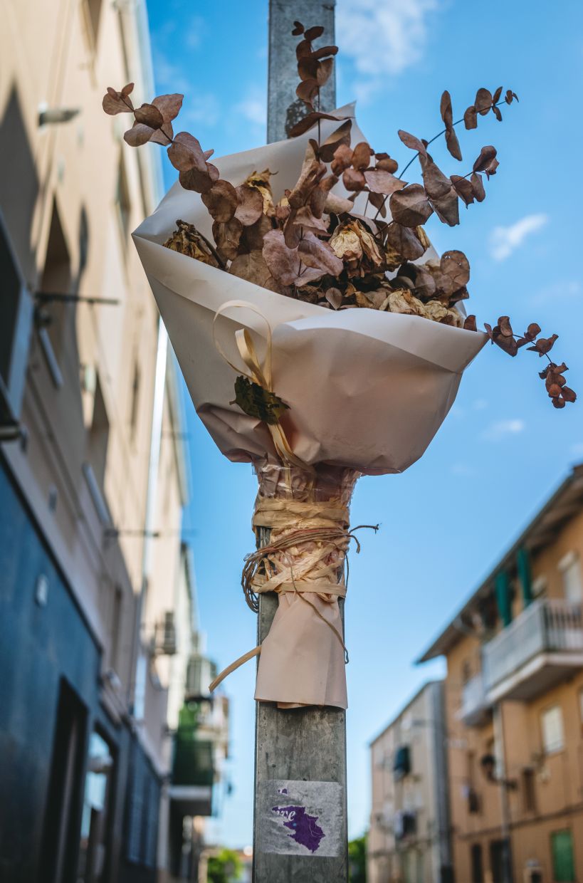A memorial bouquet of roses and eucalyptus adorns a lamppost at the entrance to the street where Lobna Hemid lived in Madrid. (Ana Maria Arevalo Gosen/The New York Times)