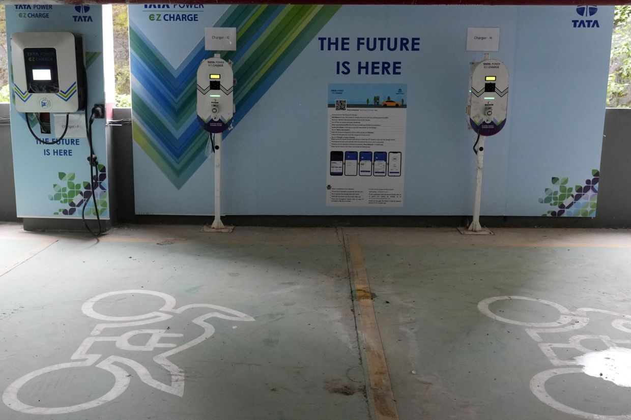 Electric vehicle charging stations are seen a residential building parking area in Mumbai, India. In the eight years since Tesla’s initial promise to sell cars in India, other automakers have launched their own EVs. But the American automaker has failed to follow through. — AP