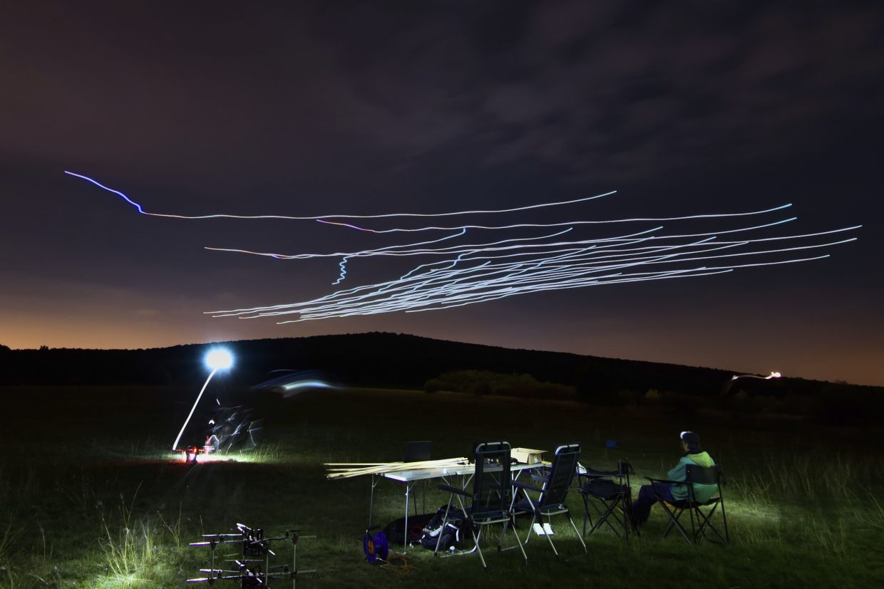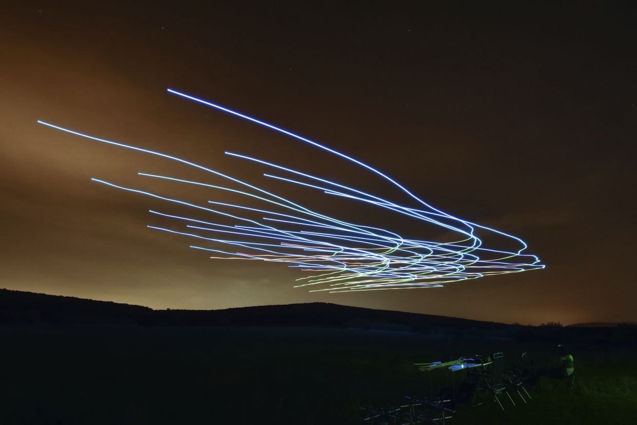 This handout photo long exposure shot shows the flight of a flock of autonomous drones during an experiment near Budapest, Hungary. — AP/Eotvos Lorand University