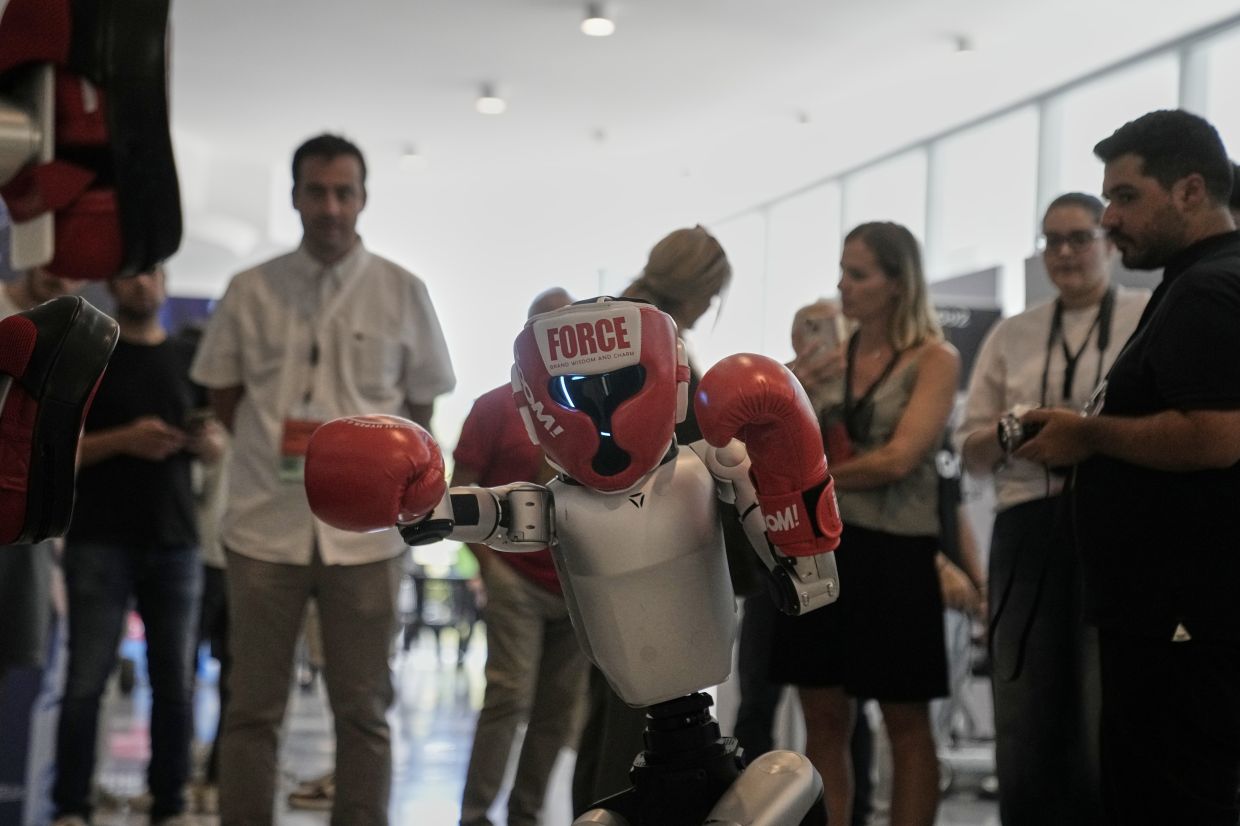 The Unitree G1 robot plays boxing with Aadeel Akhtar CEO and Founder of Psyonic at the first International Humanoid Olympiad at the Olympic Academy, in ancient Olympia, Greece, on Sept 1, 2025. — AP